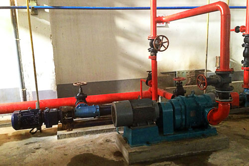 如圖所示,我們的凸輪轉(zhuǎn)子泵替代了原來(lái)的單螺桿泵,圖上為一臺(tái)單螺桿泵和凸輪轉(zhuǎn)子泵,可以看到介質(zhì)流經(jīng)這兩臺(tái)泵腔內(nèi)的行程是完全不同的,凸輪泵很短,也是取代原有螺桿泵的主要原因,目前單螺桿泵做為備用泵!